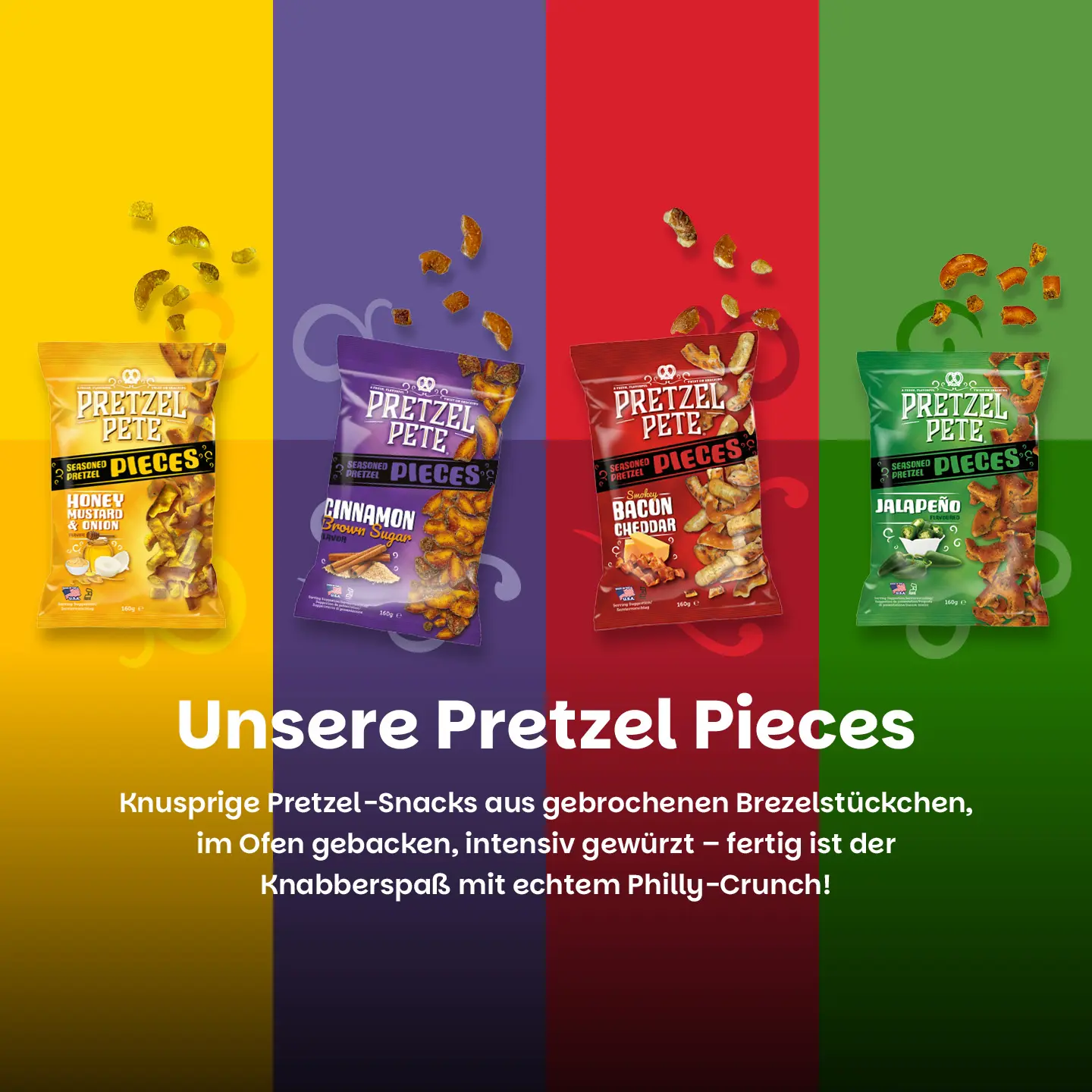 Pretzel Pete steht für typische amerikanische Pretzel-Snacks – knusprig, charakterstark und voller Geschmack. Aus der Wiege der amerikanischen Pretzel-Kultur stammen unsere Pretzel Pieces, klassischen Brezeln, kreativen Pretzel Mixes und gefüllten Bites, die nach authentischer US-Rezeptur gebacken werden.